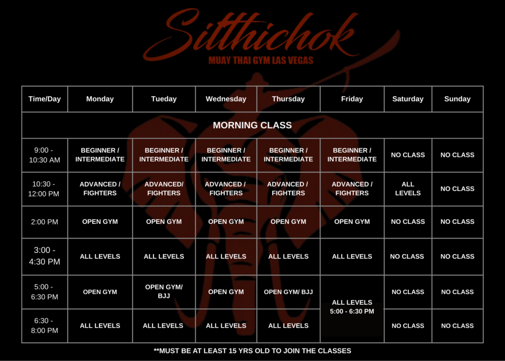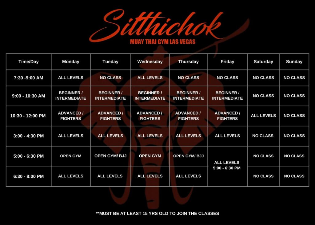 SITTHICHOK MUAY THAI GYM " THE SMILING WARRIORS TEAM " PRICING MONTHLY $230 3 MONTH CONTRACT $220 6 MONTH CONTRACT $210 12 MONTH CONTRACT $200 DROP IN $35 WALK IN PRIVATES30 MINS PAD SESSION3 DAYS FREE TRIALS FOR LOCALS SCHEDULE GOT A QUESTION? CALL OR TEXT US 702-576-3862 5693 S JONES BLVD #103, LAS VEGAS, NV 89118